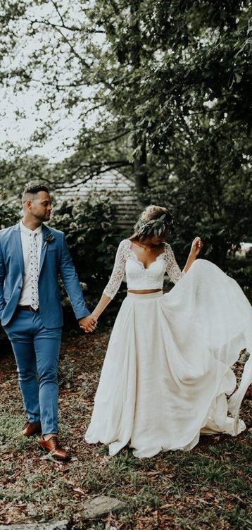 3/4 Sleeve Lace Ivory Chiffon Rustic Wedding Dresses Cheap Two Piece prom dress cg7460