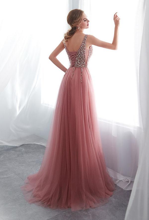 Sparkly V-Neck Beaded Long Prom Dress Fahion Beadings Evening Party Dress Custom Made Tulle Beads School Dance Dresses cg470