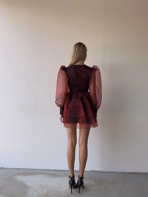 Burgundy Polka Dots Mesh Tiered Ruffled Mini Length Tulle Short Prom Dresses Sexy Deep V Neck Latern Sleeve Party Dress cg25115