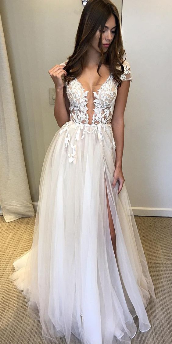 Cap Sleeve Deep V-neck Prom Dress With Appliques Sexy Split Wedding Dresses cg8006
