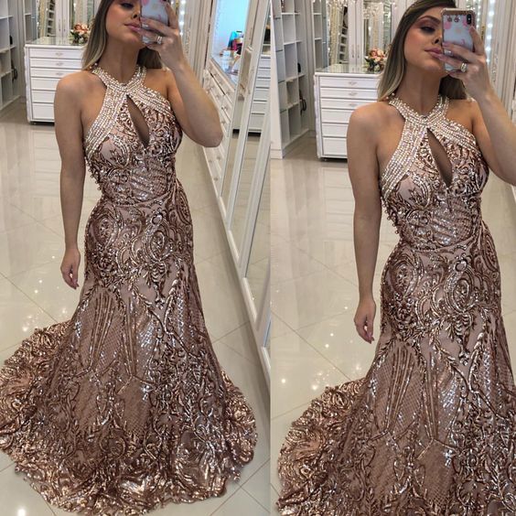 Champagne Prom Dresses, Sequins Prom Dresses, Halter Prom Dresses, Sparkly Prom Dresses cg22644