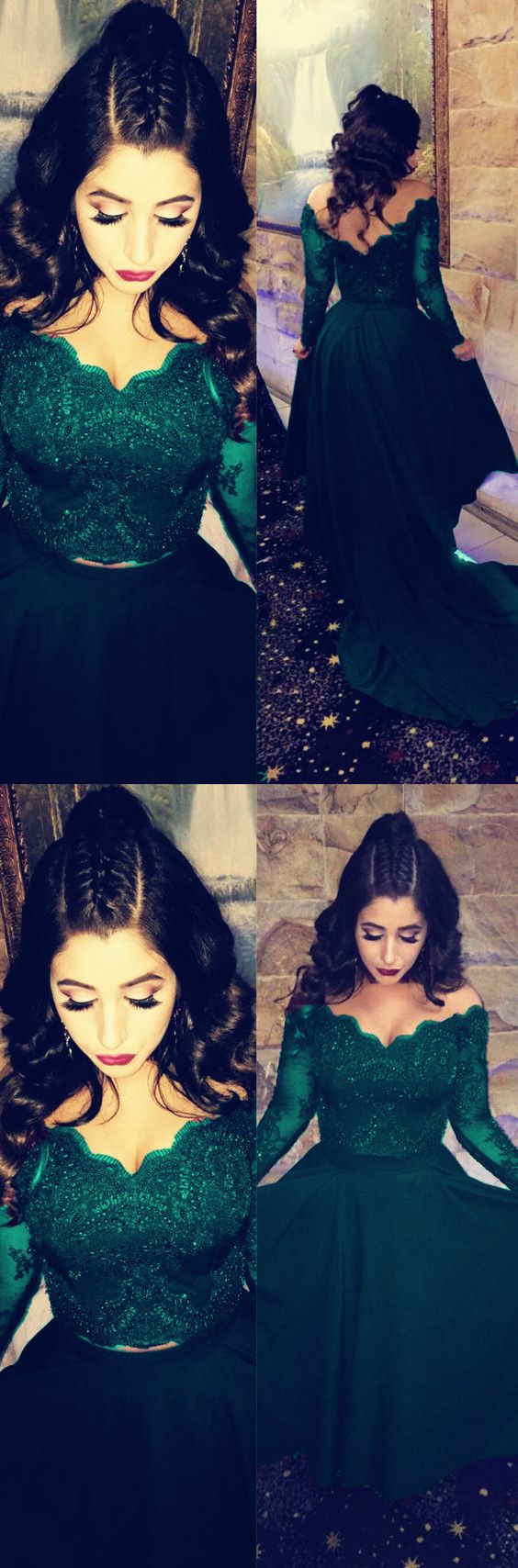Elegant Long Sleeves Lace Crop Chiffon Prom Dresses Two Piece cg3767
