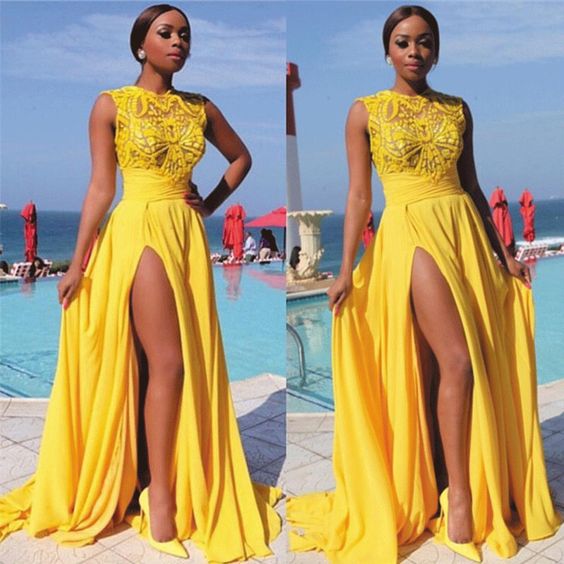 Embroidery Prom Dresses 2019 Sleeveless Yellow Chiffon A Line Prom Gown cg4074