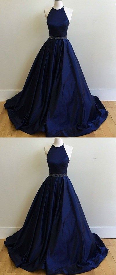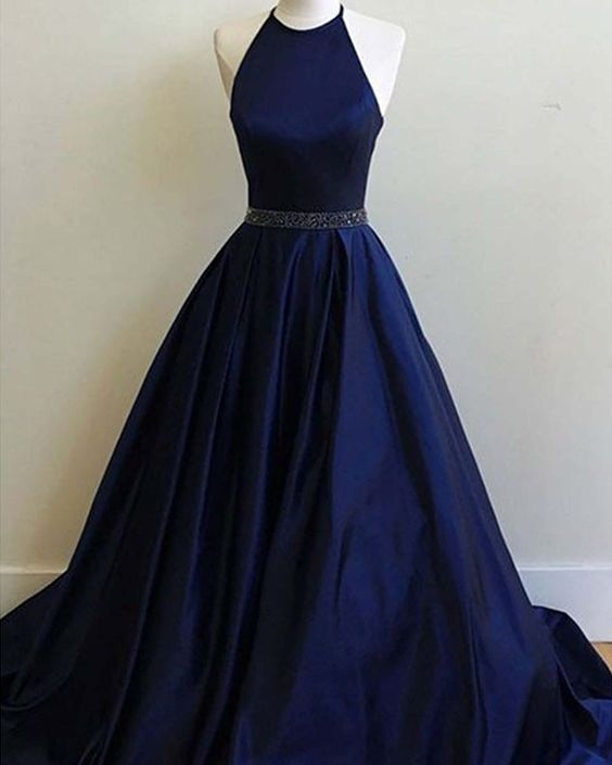 halter navy blue satin prom dress with belt, long simple formal dress cg690