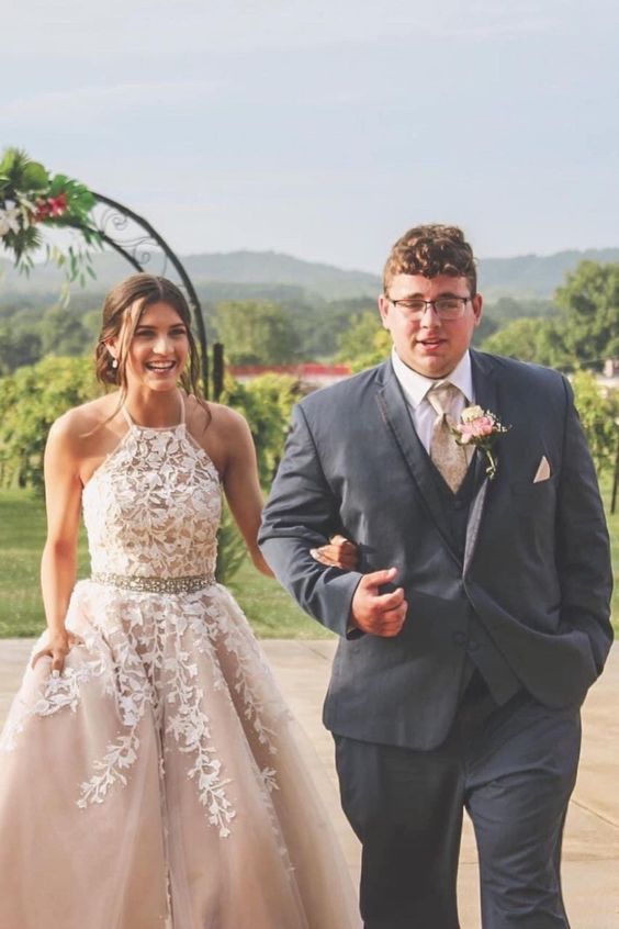 long formal prom dress features halter neckline and lace appliques cg21708