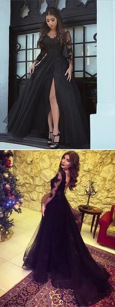 Long Sleeves Sexy Split Black Cheap Long Evening Prom Dresses cg694