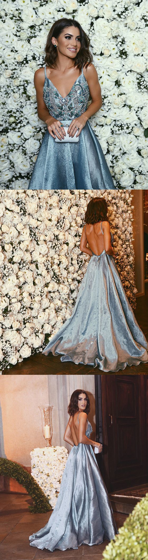 Luxurious A-line Straps Blue Formal Evening Dress,Sexy Backless Beaded Deep V Neckline prom dresses cg614