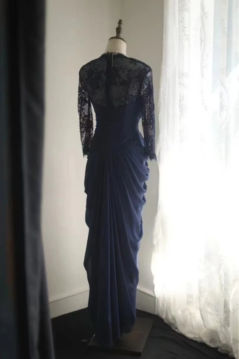 Navy Blue Lace Prom Dresses, Long Evening Dress Vintage Formal Dress cg25978