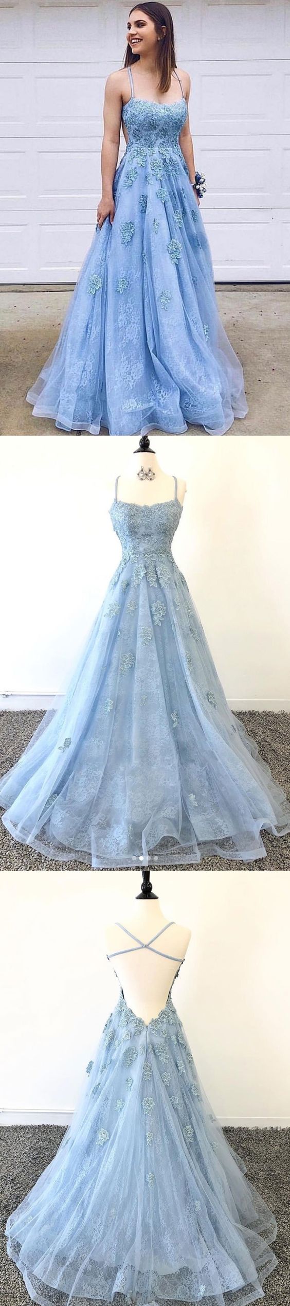Open Back Prom Dresses with Spaghetti Straps Aline Sky Blue Long Lace Prom Dress cg1033