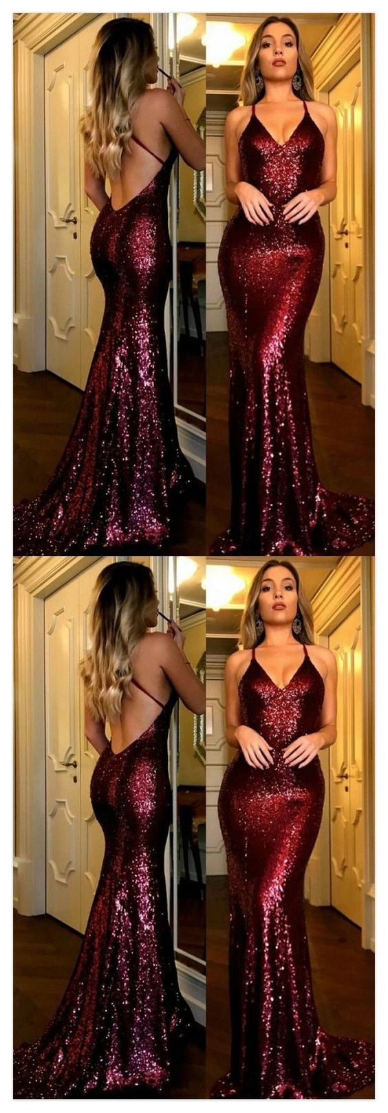 Sexy Halter V-Neck Open Back Sequined Burgundy Prom Dresses Long Evening Gowns cg15963
