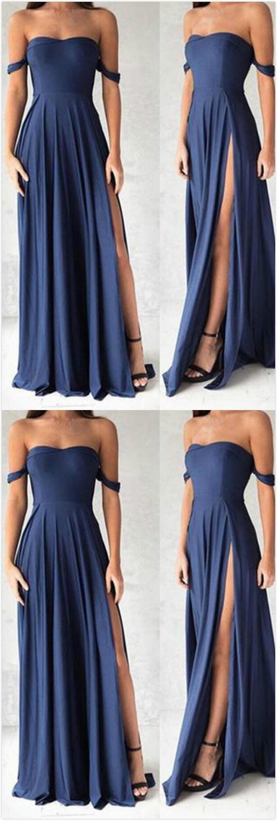 Sexy Off-Shoulder Prom Dress, Navy Blue Chiffon Prom Dress, Slit Side Prom Dress cg983