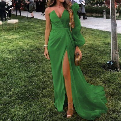 Sexy V Collar Single Sleeve Solid Color Stitching Evening Dresses prom dress with split cg13198
