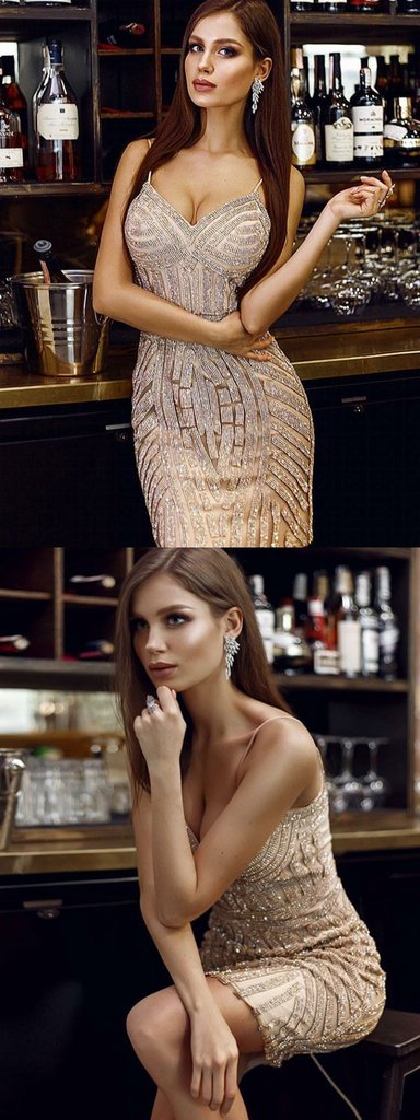 Sheath Spaghetti Straps Champagne Short Tight Homecoming Dress cg662