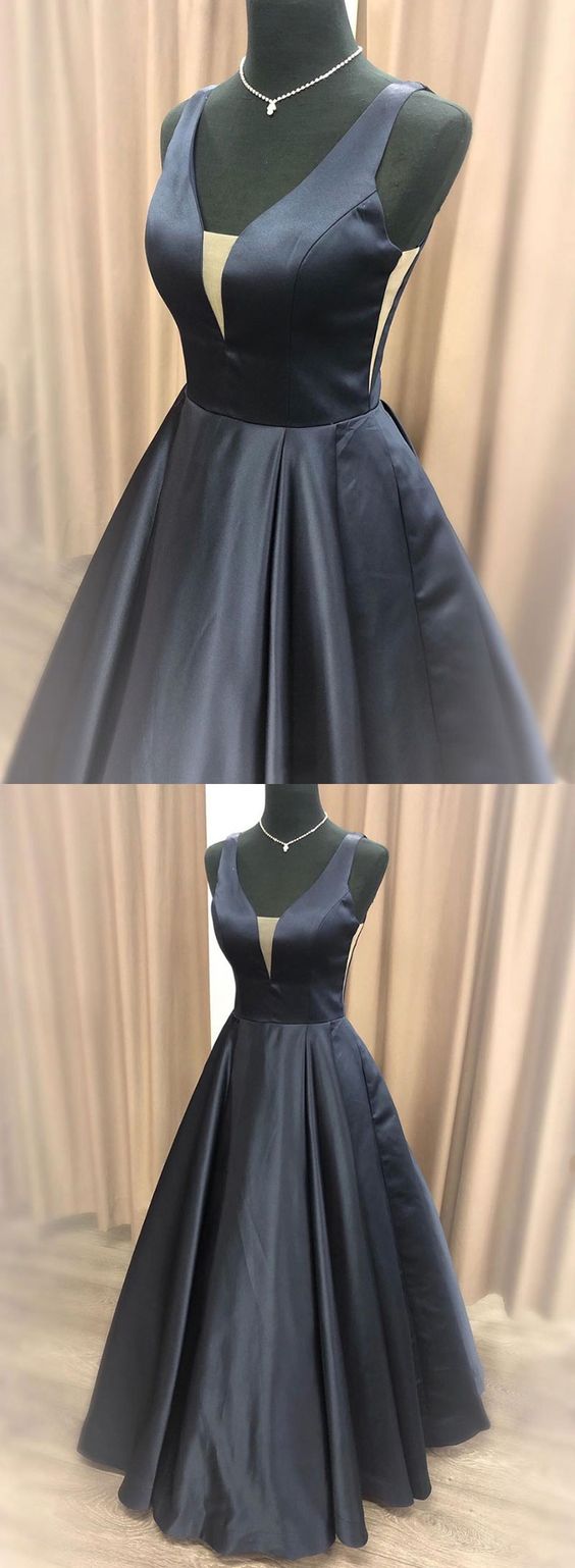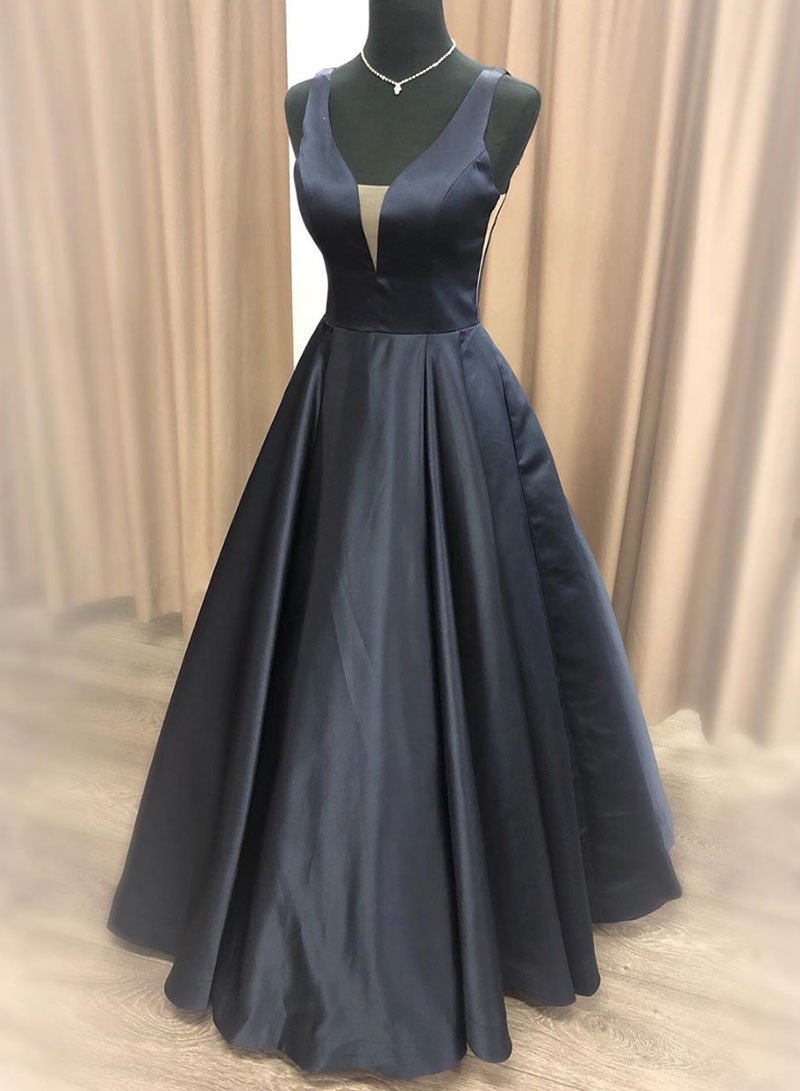 Simple black v neck satin long prom dress, black evening dress cg718