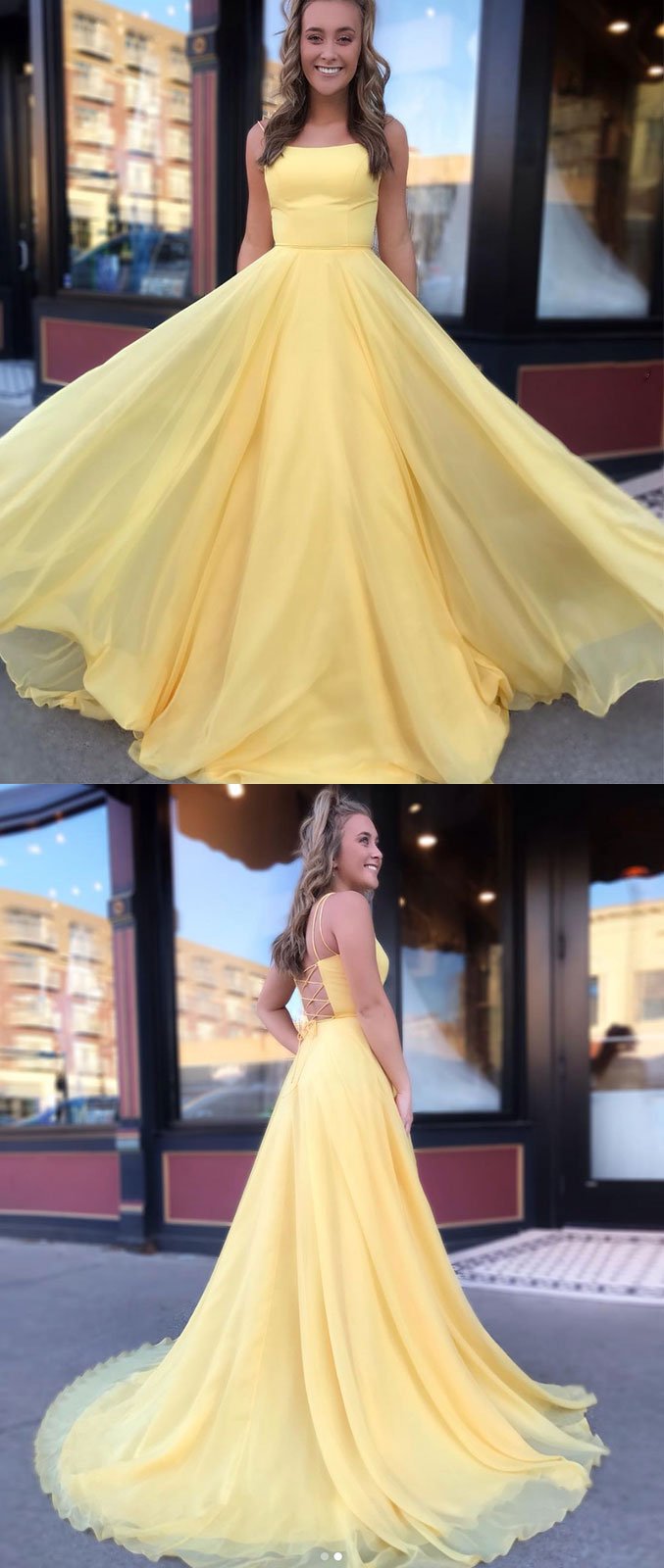 Simple yellow chiffon long prom dress, yellow evening dress cg681